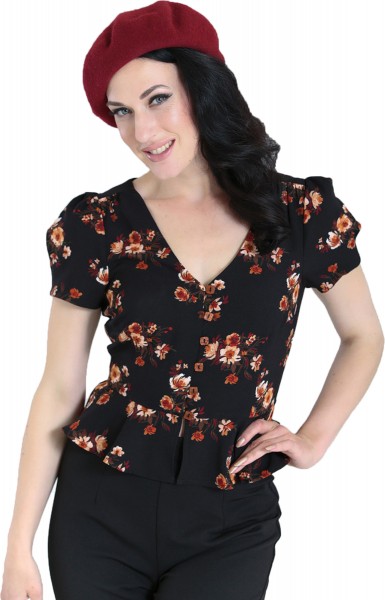 Die Orlan Vintage Bluse ist die perfekte Wahl für den Übergang in die kühleren Monate und besticht durch ihr herbstliches Design. Gefertigt aus weichem, leichtem Viskosematerial, bietet diese Bluse ein angenehmes Tragegefühl und sorgt mit ihrem schwarzen Grund und dem herbstlichen Blatt- und Blumenmuster für stilvolle Eleganz.