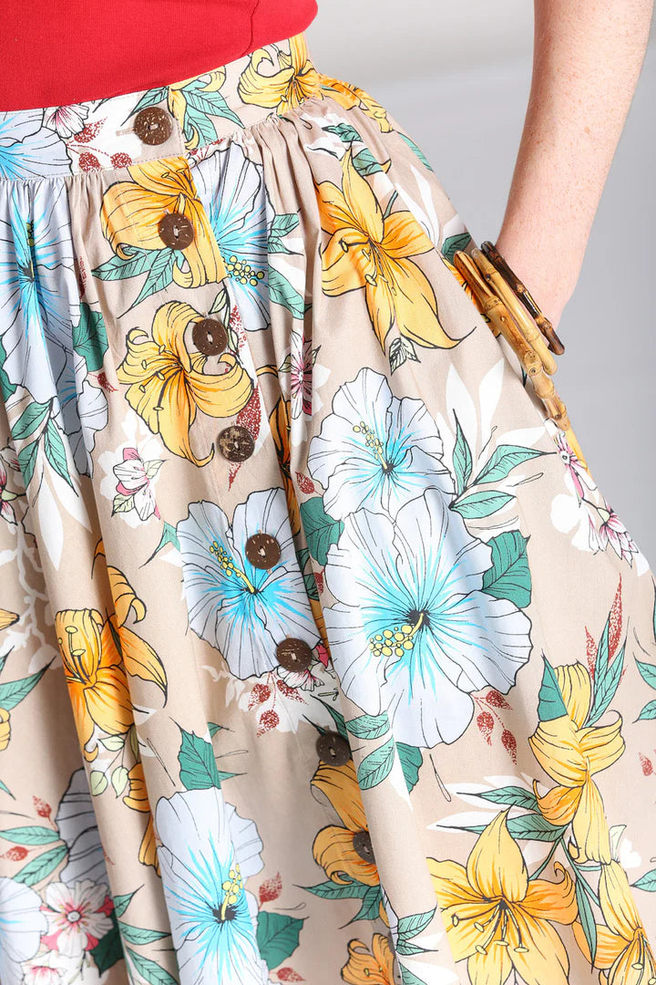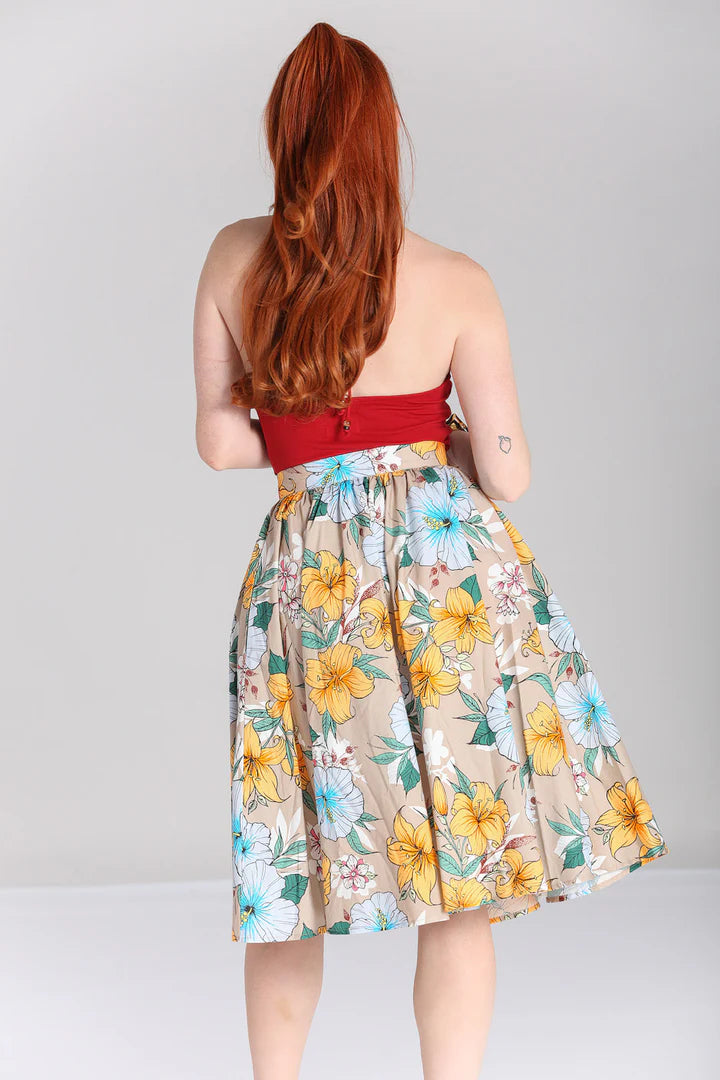 Mit dem Pattaya Tropical Hibiskus Rock bringst du tropisches Flair in deinen Kleiderschrank! Dieser wunderschöne 50er-Jahre Rock ist mit großen, leuchtenden Sommerblumen in Orange und Blau auf einem sanften hellbraunen Grund bedruckt – perfekt, um deinem Outfit eine exotische und farbenfrohe Note zu verleihen.